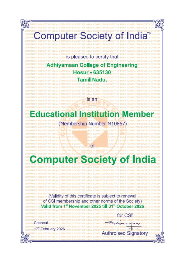 Computer Society of India is the very first profession society started for Computer professionals. At Adhiyamaan CSI student branch was started at 2003, through CSI student branch we have organized many events for the benefit of students and faculty. Hosur has become a vibrant industrial hub. Even though the IT capital of India, Bangalore, is a mere stones' throw away, Hosur has lagged behind in harnessing the benefits of IT. There is a need to bridge this gap.