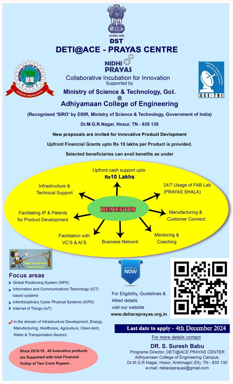 The Center will facilitate the Management team, that has extensive experience in entrepreneurship, product development, and marketing, securing Venture Capital funding and organizational development. In addition to this, an advisory board consisting of eminent academicians and expert professionals from diversified industries guide the incubatees. DETI@ACE has a very good relation with a network of players in its business incubation ecosystem. Benefits of being in the network result in providing considerable value addition in its services to the incubatees. DETI@ACE is situated in the Adhiyamaan College of Enginnering, Hosur. Hence, DETI@ACE leverages all the resources that are available within the campus such as access to laboratory, workshops, development and testing centers, computing resources, internet access and above all, the human resources. In addition to these resources, DETI@ACE also has a network of Eminent Professionals, Academicians and Research Connoisseur’s as mentors for Product Development, Bankers, Venture Capitalists and AI who extend support to these ventures.